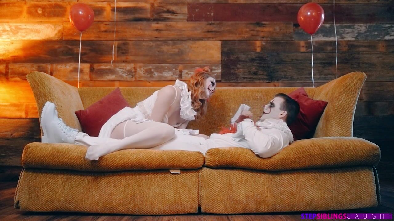 Redhead Scarlet Skies dresses as a spooky clown and scares her stepbro into letting her hop on his hardon and ride him