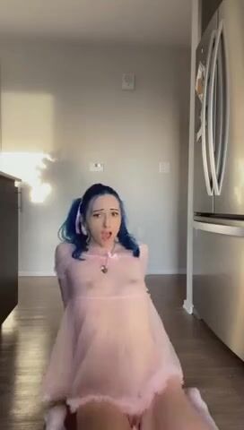 I am wearing a cute pink dress and I get on my knees on the hardwood and bounce on my dildo for you.
