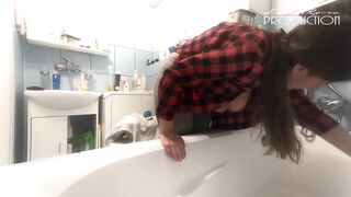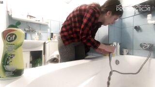 Lena Rose downblouse while cleaning bathtube